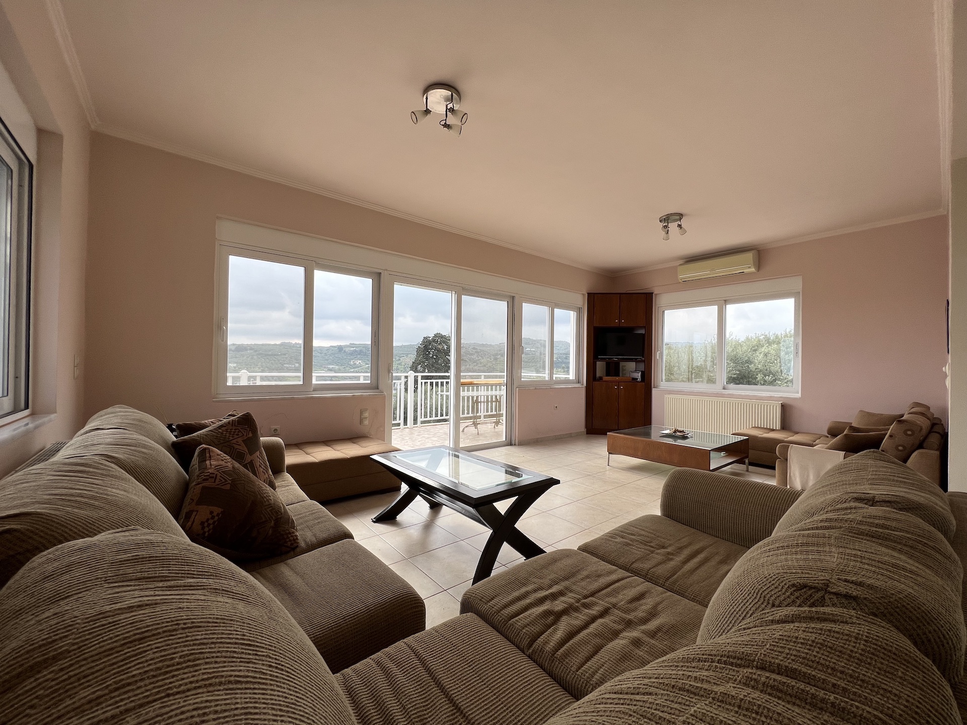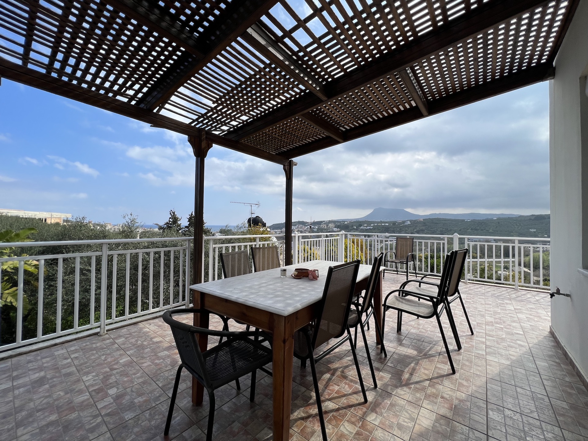 Από το καθιστικό, βγείτε σε μια ευρύχωρη βεράντα που προσφέρει υπέροχη θέα στην περιοχή του Αποκόρωνα και τη θάλασσα που αστράφτει πέρα από αυτήν. Είναι το ιδανικό σημείο για να απολαύσετε τον πρωινό σας καφέ ή ένα χαλαρωτικό βραδινό ποτό καθώς ο ήλιος δύει.